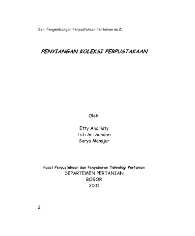 Seri Pengembangan Perpustakaan Pertanian no.21 PENYIANGAN KOLEKSI PERPUSTAKAAN Oleh: Etty Andriaty Tuti Sri Sundari Surya Mansjur Pusat Perpustakaan dan Penyebaran Teknologi Pertanian DEPARTEMEN PERTANIAN BOGOR 2001 2