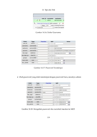 14 Tips dan Trik Gambar 14.16: Daftar Username Gambar 14.17: Password Terenkripsi • Ubah password yang telah terenkripsi dengan password baru, misalnya admin Gambar 14.18: Mengubah password dan merubah function ke MD5 119