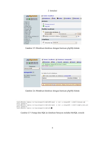 2 Instalasi Gambar 2.5: Membuat database dengan bantuan phpMyAdmin Gambar 2.6: Membuat database dengan bantuan phpMyAdmin Gambar 2.7: Dump data SQL ke database Senayan melalui MySQL console 6