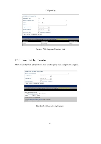 7 Reporting Gambar 7.11: Laporan Member List 7.10 Loan List by Member Merupakan laporan yang berisi daftar koleksi yang masih di pinjam Anggota. Gambar 7.12: Loan list by Member 62