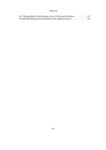 Daftar Isi 14.9 Mengaktifkan SLiMS sebagai service di Microsoft Windows . . . . . . . 117 14.10Jika Kehilangan Password admin pada aplikasi Senayan . . . . . . . . . 118 viii