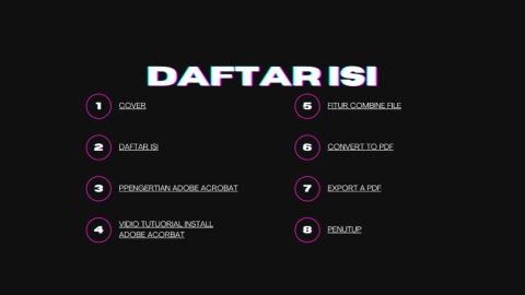 DAFTAR ISI DAFTAR ISI DAFTAR ISI 1 1 1 COVER 5 5 5 FITUR COMBINE FILE 2 2 2 DAFTAR ISI 6 6 6 CONVERT TO PDF 3 3 3 PPENGERTIAN ADOBE ACROBAT 7 7 7 EXPORT A PDF VIDIO TUTUORIAL INSTALL 4 4 4 8 8 8 PENUTUP ADOBE ACORBAT