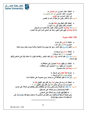 43 %u0625%u0639%u062f%u0627%u062f: %u062f. %u0623%u062d%u0645%u062f %u0645%u062d%u0645%u062f %u062f%u0644%u0644%u0648%u2022 %u0627%u0644%u062e%u0637%u0623: %u0627%u0639%u062a%u0630%u064e%u0631 %u0627%u0644%u0645%u062f%u0651%u0631 %u064f%u0633 %u0639%u0646 %u0627%u0644%u062d%u0636%u0648%u0631.%u00d7 %u0627%u0644%u0635%u0648%u0627%u0628: %u0627%u0639%u062a%u0630%u064e%u0631 %u0627%u0644%u0645%u062f%u0651%u0631 %u064f%u0633 %u0639%u0646 %u0639%u062f%u0645 %u0627%u0644%u062d%u0636%u0648%u0631.%u221a %u0623%u0648: %u0627%u0639%u062a%u0630%u064e%u0631 %u0627%u0644%u0645%u062f%u0651%u0631 %u064f%u0633 %u0639%u0646 %u0627%u0644%u063a%u064a%u0627%u0628.%u0627%u0644%u0633%u0628%u0628: %u0623%u0644 %u064e%u0651%u0646 %u0627%u0627%u0644%u0639%u062a%u0630%u0627%u0631 %u064a%u0643%u0648%u0646 %u0639%u0646 %u062e%u0637%u0623 %u0623%u0648 %u0630%u0646%u0628 %u0623%u0648 %u062a%u0642%u0635%u064a%u0631.%u0652%u062a %u0642%u0648%u0627%u0647.%u00d7%u0650%u0641%u0630%u064e%u064e%u0644 %u0627%u0644%u0628%u0637 %u064f%u0644 %u062d%u062a%u0651%u0649 %u0646%u064e%u2022 %u0627%u0644%u062e%u0637%u0623: %u0642%u0627%u062a%u064e%u0650%u0641%u062f %u0652%u062a %u0642%u0648%u0627%u0647.%u221a%u064e%u0644 %u0627%u0644%u0628%u0637 %u064f%u0644 %u062d%u062a%u0651%u0649 %u0646%u064e%u0627%u0644%u0635%u0648%u0627%u0628: %u0642%u0627%u062a%u064e%u0646%u0641%u064e%u0630 )%u0628%u0627%u0644%u0630%u0627%u0644(: %u0627%u0644%u0636%u0648 %u064f%u0621 %u0645%u0646 %u0627%u0644%u0632%u062c%u0627%u062c. %u064e %u0627%u0644%u0633%u0628%u0628:%u0627%u062e%u062a%u0631%u0642 %u0648%u0627%u062c%u062a%u0627%u0632. %u0646%u0642%u0648%u0644: %u0646%u0641%u064e%u0630%u064e%u0623%u0645%u0627 %u0646%u0650%u0641%u064e%u062f )%u0628%u0627%u0644%u062f%u0627%u0644(: %u0641%u0647%u064a %u062a%u0639%u0646%u064a %u0627%u0646%u062a%u0647%u0649%u060c %u0648%u0647%u0630%u0627 %u0647%u0648 %u0627%u0644%u0645%u0639%u0646%u0649 %u0627%u0644%u0645%u0631%u0627%u062f %u0641%u064a %u0647%u0630%u0647 %u0627%u0644%u0639%u0628%u0627%u0631%u0629.%u062b%u0627%u0644%u062b%u0627%u064b: %u0623%u062e%u0637%u0627%u0621 %u0646%u062d%u0648%u064a%u0629:%u2022 %u0627%u0644%u062e%u0637%u0623: %u0627%u0644 %u062a%u064e%u0646%u0633%u0649 %u0650%u0630%u0643%u064e%u0631 %u0650%u0647%u0644%u0644%u0627.%u00d7%u062a%u064e%u0646 %u064e%u0633 %u0650%u0630%u0643%u064e%u0631 %u0650%u0647%u0644%u0644%u0627.%u221a %u0627%u0644%u0635%u0648%u0627%u0628: %u0627%u0644 %u0627%u0644%u0633%u0628%u0628: %u0627%u0644%u0641%u0639%u0644 )%u062a%u0646%u0633%u0649( %u0645%u0639%u062a %u0651%u0644 %u0627%u0622%u0644%u062e%u0631%u060c %u0648%u0647%u0648 %u0647%u0646%u0627 %u0645%u062c%u0632%u0648%u0645 %u0628%u0627%u0644 %u0627%u0644%u0646%u0627%u0647%u064a%u0629 %u0648%u0639%u0627%u0644%u0645%u0629 %u062c%u0632%u0645%u0647 %u062d%u0630%u0641 %u062d%u0631%u0641 %u0627%u0644%u0639%u0644%u0629.%u2022 %u0627%u0644%u062e%u0637%u0623: %u0627%u0644 %u0632%u0627 %u064e%u0644 %u0632%u064a %u062f %u0645%u0631%u064a%u0636%u0627%u064b.%u00d7%u0627%u0644%u0635%u0648%u0627%u0628: %u0645%u0627 %u0632%u0627 %u064e%u0644 %u0632%u064a %u062f %u0645%u0631%u064a%u0636%u0627%u064b.%u221a%u0627%u0644%u0633%u0628%u0628: )%u0627%u0644 %u0632%u0627%u0644(: %u062a%u0641%u064a%u062f %u0627%u0644%u062f%u0639%u0627%u0621. %u0648)%u0645%u0627 %u0632%u0627%u0644(: %u062a%u0641%u064a%u062f %u0627%u0625%u0644%u062e%u0628%u0627%u0631. %u0648%u0627%u0644%u0642%u0627%u0639%u062f%u0629 %u062a%u0642%u0648%u0644: %u0625%u0630%u0627 %u062f%u062e%u0644%u062a )%u0627%u0644( %u0639%u0644%u0649 %u0627%u0644%u0645%u0627%u0636%u064a %u0641%u0625%u0646%u064e%u0651%u0647%u0627 %u062a%u0641%u064a%u062f %u0627%u0644%u062f%u0639%u0627%u0621.%u2022 %u0627%u0644%u062e%u0637%u0623: %u0645 %u0652%u0646 %u062d %u0650%u0642%u0651%u0647%u0627 %u0648%u062d%u0650%u062f%u0647%u0627 %u0627%u0644%u062d%u0635%u0648 %u064f%u0644 %u0639%u0644%u0649 %u0627%u0644%u0645%u0643%u0627%u0641%u0623%u0629.%u00d7%u0627%u0644%u0635%u0648%u0627%u0628: %u0645 %u0652%u0646 %u062d %u0650%u0642%u0651%u0647%u0627 %u0648%u062d%u062f%u064e%u0647%u0627 %u0627%u0644%u062d%u0635%u0648 %u064f%u0644 %u0639%u0644%u0649 %u0627%u0644%u0645%u0643%u0627%u0641%u0623%u0629.%u221a%u0627%u0644%u0633%u0628%u0628: )%u0648%u062d%u062f%u064e%u0647%u0627(: %u062d%u0627%u0644 %u0645%u0646%u0635%u0648%u0628%u0629.%u2022 %u0634%u0627%u0631%u0643 %u0627%u0644%u0637%u0627%u0644 %u0650%u0628%u0643%u0627%u0641%u0629 %u0641%u064a %u0627%u0644%u0631%u062d%u0644%u0629. %u00d7 %u064f%u0634%u0627%u0631%u0643 %u0627%u0644%u0637%u0627%u0644 %u064f%u0628 %u0643%u0627%u0641%u0629%u064b %u0641%u064a %u0627%u0644%u0631%u062d%u0644%u0629. %u221a%u0627%u0644%u0633%u0628%u0628: %u0623%u0644%u0646 %u0643%u0627%u0641%u0629 %u0627%u0644 %u062a%u0642%u0628%u0644 %u0627%u0625%u0644%u0636%u0627%u0641%u0629 %u0625%u0644%u0649 %u0645%u0627 %u0628%u0639%u062f%u0647%u0627%u060c %u0648%u0647%u064a %u0645%u0646%u0635%u0648%u0628%u0629 %u0639%u0644%u0649 %u0627%u0644%u062d%u0627%u0644%u064a%u0629 %u062f%u0627%u0626%u0645%u0627%u064b.%u2022 %u0627%u0644%u062e%u0637%u0623: %u0644%u0645 %u0623%u0631%u0633%u0628 %u0641%u064a %u062d%u064a%u0627%u062a%u064a %u0623%u0628%u062f%u0627%u064b%u060c %u0648%u0644%u0646 %u0623%u0642%u0628%u0644 %u0628%u063a%u064a%u0631 %u0627%u0644%u062a%u0641%u0651%u0648%u0642 %u0642 %u0651%u0637. %u00d7%u0642 %u0651%u0637%u060c %u0648%u0644%u0646 %u0623%u0642%u0628%u0644 %u0628%u063a%u064a%u0631 %u0627%u0644%u062a%u0641%u0651%u0648%u0642 %u0623%u0628%u062f%u0627%u064b. %u221a %u0627%u0644%u0635%u0648%u0627%u0628: %u0644%u0645 %u0623%u0631%u0633%u0628 %u0641%u064a %u062d%u064a%u0627%u062a%u064a %u0623%u0628%u062f%u0627%u064b %u0648%u0642 %u0651%u0637 %u0647%u0645%u0627 %u0638%u0631%u0641%u0627 %u0632%u0645%u0627%u0646 %u0628%u0645%u0639%u0646%u0649 %u0648%u0627%u062d%u062f %u0647%u0648 )%u0645%u0637%u0644%u0642%u0627%u064b(%u060c %u0648%u0644%u0643%u0646 %u064a%u062e%u062a%u0644%u0641%u0627%u0646 %u0641%u064a %u0627%u0644%u062f%u0627%u0644%u0644%u0629 %u0639%u0644%u0649 %u0627%u0644%u0632%u0645%u0646: %u0627%u0644%
