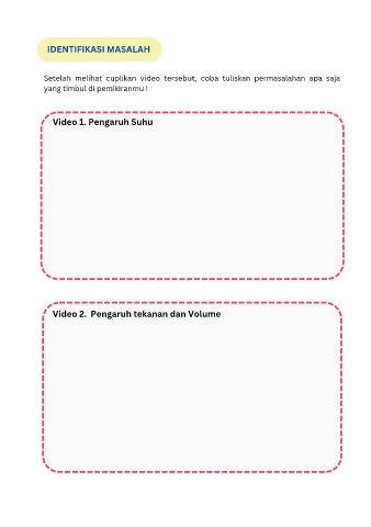 IDENTIFIKASI MASALAH Setelah melihat cuplikan video tersebut, coba tuliskan permasalahan apa saja yang timbul di pemikiranmu ! Video 1. Pengaruh Suhu Video 2. Pengaruh tekanan dan Volume