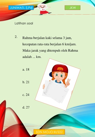JUNIWATI, S.Pd JKW Latihan soal 2. Rahma berjalan kaki selama 3 jam, kecepatan rata-rata berjalan 6 km/jam. Maka jarak yang ditempuh oleh Rahma adalah ... km. a. 18 b. 21 c. 24 d. 27 SDN MOJO III/222