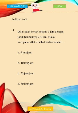 JUNIWATI, S.Pd JKW Latihan soal 4. Qila sudah berlari selama 9 jam dengan jarak tempuhnya 270 km. Maka, kecepatan atlet tersebut berlari adalah ... a. 9 km/jam b. 10 km/jam c. 20 jam/jam d. 30 km/jam SDN MOJO III/222