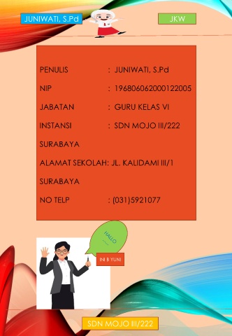 JUNIWATI, S.Pd JKW PENULIS : JUNIWATI, S.Pd NIP : 196806062000122005 JABATAN : GURU KELAS VI INSTANSI : SDN MOJO III/222 SURABAYA ALAMAT SEKOLAH: JL. KALIDAMI III/1 SURABAYA NO TELP : (031)5921077 INI B YUNI SDN MOJO III/222