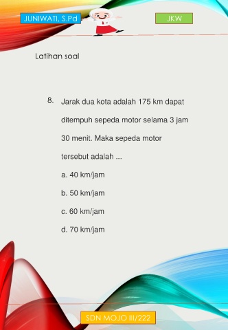 JUNIWATI, S.Pd JKW Latihan soal 8. Jarak dua kota adalah 175 km dapat ditempuh sepeda motor selama 3 jam 30 menit. Maka sepeda motor tersebut adalah ... a. 40 km/jam b. 50 km/jam c. 60 km/jam d. 70 km/jam SDN MOJO III/222