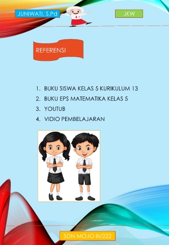 JUNIWATI, S.Pd JKW REFERENSI 1. BUKU SISWA KELAS 5 KURIKULUM 13 2. BUKU EPS MATEMATIKA KELAS 5 3. YOUTUB 4. VIDIO PEMBELAJARAN SDN MOJO III/222