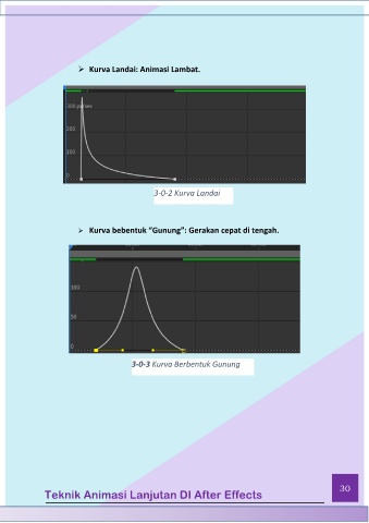 Kurva Landai: Animasi Lambat. 3-0-2 Kurva Landai Kurva bebentuk “Gunung”: Gerakan cepat di tengah. 3-0-3 Kurva Berbentuk Gunung 30 Teknik Animasi Lanjutan DI After Effects