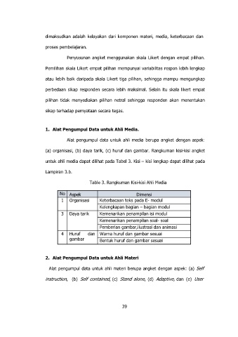 (a) organisasi, (b) daya tarik, (c) huruf dan gambar. Rangkuman kisi-kisi angket