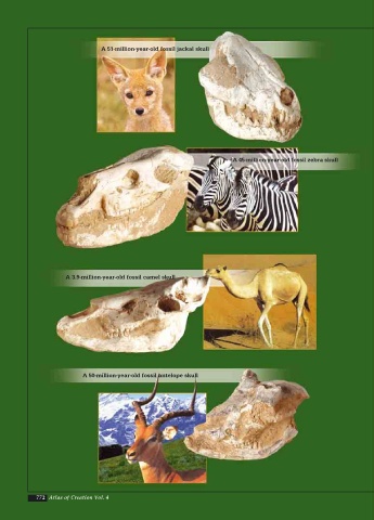A 51-million-year-old fossil jackal skull A 45-million-year-old fossil zebra skull A 3.9-million-year-old fossil camel skull A 50-million-year-old fossil antelope skull 772 Atlas of Creation Vol. 4