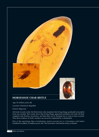 fossilized in amber, 25 million years old. The horseshoe crab beetles deny evolution.