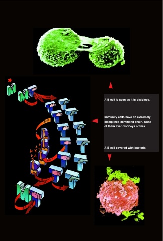 A B cell is seen as it is disjoined. Immunity cells have an extremely disciplined command chain. None of them ever disobeys orders. A B cell covered with bacteria.