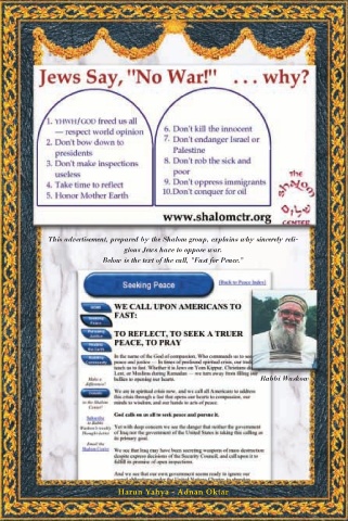 This advertisement, prepared by the Shalom group, explains why sincerely reli- gious Jews have to oppose war. Below is the text of the call, "Fast for Peace." Rabbi Waskow Harun Yahya - Adnan Oktar