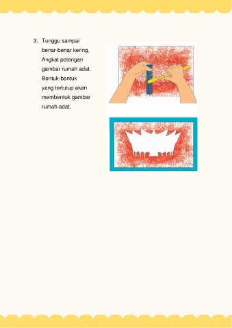 3. Tunggu sampai benar-benar kering. Angkat potongan gambar rumah adat. Bentuk-bentuk yang tertutup akan membentuk gambar rumah adat.