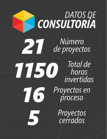 DATOS DE CONSULTORÍA 21 de proyectos Número 1150 invertidas Total de horas 16 Proyectos en proceso 5 Proyectos cerrados