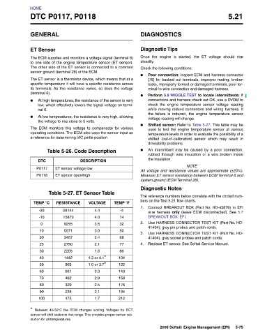 DTC P0117, P0118 The ECM supplies and monitors a voltage signal (terminal 6) to one side of the engine temperature sensor (ET sensor). The other side of the ET sensor is connected to a common sensor ground (terminal 26) of the ECM. The ET sensor is a thermistor device, which means that at a specific temperature it will have a specific resistance across its terminals. As this resistance varies, so does the voltage At high temperatures, the resistance of the sensor is very low, which effectively lowers the signal voltage on termi- At low temperatures, the resistance is very high, allowing the voltage to rise close