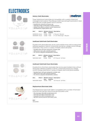 ModalitiesElectrodesMetron Cloth ElectrodesThese replacement electrodes are compatible with a variety of electrical massagers & stimulators. They feature a cloth topcoat & gel track bottom. Each electrode has a single-patient use of 7-8 times. %u2022 Excellent for clinical or at home use%u2022 Hydrogel molds comfortably to body contours%u2022 Carbon film offers a uniform current distribution%u2022 Developed for single-patient useSKU ENVI # Billable ItemInternal ModifierDescription081591270 21444 A4556 T045 2%u201d Round - 80 pack081591387 21445 A4556 T046 2%u201d x 3.5%u201d Rectangle - 80 packAxelGaard ValuTrode Cloth ElectrodesDurable cloth electrodes that can be used multiple times without losing their adhesive qualities or electric conductivity during low-voltage current therapy treatments. They come in a variety of shapes, sizes & sell packs.%u2022 Durable cloth with gel coating for multiple uses%u2022 Offers short term pain relief for patients%u2022 For clinics or physical rehabilitation centersSKU ENVI # Billable ItemInternal ModifierDescription081214162 23311 A4556 T045 2.75%u201d Round - 40 PackAxelGaard ValuTrode Foam ElectrodesDurable 2mm thick foam electrodes that can be used multiple times without losing their adhesive qualities or electric conductivity during low-voltage current therapy treatments. A variety of shapes, sizes & sell packs available.%u2022 Durable foam with gel coating for multiple uses%u2022 Offers short term pain relief for patients%u2022 For clinics or physical rehabilitation centersSKU ENVI # Billable ItemInternal ModifierDescription081214329 10529 A4556 T048 1.25%u201d Round - 40 PackReplacement Electrode CableThe Replacement Electrode Cable is compatible with a number of Sonicator Units and with Sys*Stim Neuromuscular Stimulator units.%u2022 Fits: Sonicator Plus 930 Combination Unit%u2022 Sonicator Plus 994 Combination Unit%u2022 Sonicator Plus 992 Combination Unit%u2022 Sys*Stim Neuromuscular Stimulator unitsSKU081225960101
