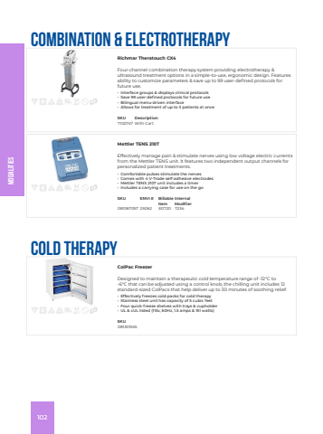 ModalitiesCombination & ElectrotherapyRichmar Theratouch CX4Four-channel combination therapy system providing electrotherapy & ultrasound treatment options in a simple-to-use, ergonomic design. Features ability to customize parameters & save up to 99 user-defined protocols for future use.%u2022 Interface groups & displays clinical protocols%u2022 Save 99 user-defined protocols for future use%u2022 Bilingual menu-driven interface%u2022 Allows for treatment of up to 3 patients at onceSKU Description7102747 With CartMettler TENS 210TEffectively manage pain & stimulate nerves using low voltage electric currents from the Mettler TENS unit. It features two independent output channels for personalized patient treatments.%u2022 Comfortable pulses stimulate the nerves%u2022 Comes with 4 V-Trode self-adhesive electrodes%u2022 Mettler TENS 210T unit includes a timer%u2022 Includes a carrying case for use on the goSKU ENVI # Billable ItemInternal Modifier081067057 25062 E0720 T234Cold TherapyColPac FreezerDesigned to maintain a therapeutic cold temperature range of -12%u00b0C to -6%u00b0C that can be adjusted using a control knob, the chilling unit includes 12 standard-sized ColPacs that help deliver up to 30 minutes of soothing relief.%u2022 Effectively freezes cold packs for cold therapy%u2022 Stainless steel unit has capacity of 5 cubic feet%u2022 Four quick-freeze shelves with trays & cupholder%u2022 UL & cUL listed (115v, 60Hz, 1.5 amps & 151 watts)SKU081301555102
