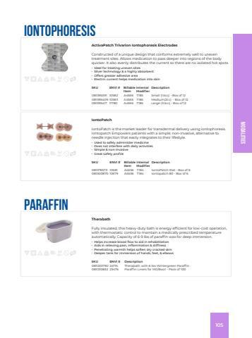 ModalitiesIontophoresisActivaPatch Trivarion Iontophoresis ElectrodesConstructed of a unique design that conforms extremely well to uneven treatment sites. Allows medication to pass deeper into regions of the body quicker. It also evenly distributes the current so there are no isolated hot spots.%u2022 Ideal for treating uneven sites%u2022 Silver technology & a highly absorbent%u2022 Offers greater adhesive area%u2022 Electric current helps medication into skinSKU ENVI # Billable ItemInternal ModifierDescription081395391 10582 A4556 T185 Small (1.5cc) - Box of 12081395409 10583 A4556 T185 Medium(2cc) - Box of 12081395417 11780 A4556 T185 Large (3.5cc) - Box of 12IontoPatchIontoPatch is the market leader for transdermal delivery using iontophoresis. Iontopatch Empowers patients with a simple, non-invasive, alternative to needle injection that easily integrates to their lifestyle.%u2022 Used to safely administer medicine%u2022 Does not interfere with daily activities%u2022 Simple & non-invasive%u2022 Great safety profileSKU ENVI # Billable ItemInternal ModifierDescription081376573 10581 A4556 T184 IontoPatch Stat - Box of 6081300870 10579 A4556 T184 Iontopatch 80 - Box of 6ParaffinTherabathFully insulated, this heavy-duty bath is energy efficient for low-cost operation, with thermostatic control to maintain a medically prescribed temperature automatically. Capacity of 6-9 lbs of paraffin wax for deep immersion.%u2022 Helps increase blood flow to aid in rehabilitation%u2022 Aids in relieving pain, inflammation & stiffness%u2022 Penetrating warmth helps soften dry cracked skin%u2022 Deeper tank for immersion of hands, feet, & elbowsSKU ENVI # Description081030790 24174 Therabath with 6 lbs Wintergreen Paraffin081030832 23476 Paraffin Liners for Mit/Boot - Pack of 100105