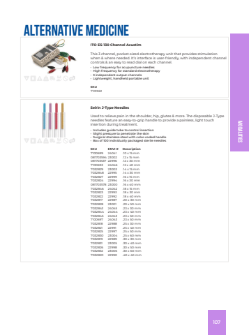ModalitiesAlternative MedicineITO ES-130 Channel AcustimThis 3 channel, pocket-sized electrotherapy unit that provides stimulation when & where needed. It%u2019s interface is user-friendly, with independent channel controls & an easy to read dial on each channel.%u2022 Low frequency for acupuncture needles%u2022 High frequency for standard electrotherapy%u2022 3 independent output channels%u2022 Lightweight, handheld portable unitSKU7101922Seirin J-Type NeedlesUsed to relieve pain in the shoulder, hip, glutes & more. The disposable J-Type needles feature an easy-to-grip handle to provide a painless, light touch insertion during treatment.%u2022 Includes guide tube to control insertion%u2022 Slight pressure to penetrate the skin%u2022 Surgical stainless-steel with color-coded handle%u2022 Box of 100 individually packaged sterile needlesSKU ENVI # Description7100699 24041 .10 x 15 mm081703594 23002 .12 x 15 mm081703537 22996 .12 x 30 mm7100693 24046 .12 x 40 mm7032829 23003 .14 x 15 mm7032848 22995 .14 x 30 mm7032827 22999 .16 x 15 mm7032824 22994 .16 x 30 mm081703578 23000 .16 x 40 mm7032846 24042 .18 x 15 mm7032823 22993 .18 x 30 mm7032822 22992 .18 x 40 mm7032817 22987 .20 x 30 mm7032828 23001 .20 x 50 mm7032843 24045 .23 x 30 mm7032844 24044 .23 x 40 mm7032845 24043 .23 x 50 mm7100697 24043 .23 x 50 mm7032818 22988 .25 x 30 mm7032821 22991 .25 x 40 mm7032825 22997 .25 x 50 mm7032830 23004 .25 x 60 mm7032819 22989 .30 x 30 mm7032831 23005 .30 x 40 mm7032826 22998 .30 x 50 mm7032832 23006 .30 x 60 mm7032820 22990 .40 x 40 mm107
