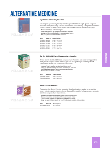 ModalitiesAlternative MedicineMyotech 2.0 Elite Dry NeedlesDeveloped specifically for dry needling. Crafted from high-grade surgical stainless steel, featuring a micro-channeled needle body. Designed for needle manipulation in deep tissue layers with thicker handle & enhanced grip.%u2022 Thicker handle & enhanced grip%u2022 Inserts smoothly for maximum patient comfort%u2022 Designed for manipulation in deep tissue layers%u2022 100 parylene-coated needles per boxSKU ENVI # Description7100522 23216 0.30 x 30 mm7100523 23219 0.30 x 40 mm7100524 23218 0.30 x 50 mm7100525 23217 0.30 x 60 mm7100527 23212 0.30 x 75 mm7100528 23213 0.40 x 100 mmTai Chi 24K Gold Plated Acupuncture NeedlesThese sterile 24K Gold Plated Acupuncture Needles are used to trigger the body%u2019s natural pain killers. The single-use design brings ease to patient treatments & reduces cross contamination.%u2022 Made of high-quality surgical stainless steel%u2022 Used to relieve aching muscles, headaches, & more%u2022 Individually wrapped to prevent contamination%u2022 Sold in boxes of 100 needlesSKU ENVI # Description7003557 25031 0.25 x 25 mm7003558 25032 0.25 x 40 mmSeirin G-Type NeedlesFeaturing the Seirin Point, a rounded tip allowing the needle to smoothly insert into the patient%u2019s skin, these disposable needles help provide a smooth, painless acupuncture experience.%u2022 Ribbed handle ensures a secure grip during removal%u2022 Deeper insertion for areas with more muscle mass%u2022 Color-coded handle for easier gauge identification%u2022 Easy-to-open blister pack for each individual needle, 100 per boxSKU ENVI # Description7032839 25035 .25 x 75mm109