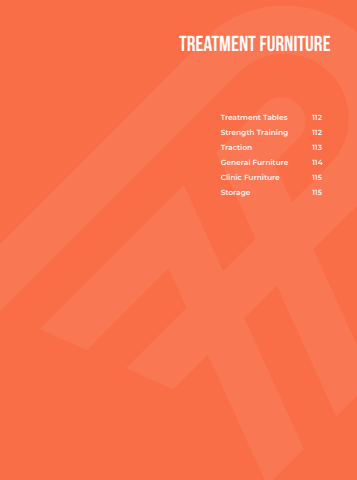 Treatment FurnitureTreatment Tables 112Strength Training 112Traction 113General Furniture 114Clinic Furniture 115Storage 115