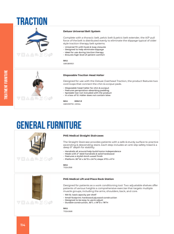Treatment FurnitureTractionDeluxe Universal Belt SystemComplete with a thoracic belt, pelvic belt & pelvic belt extender, the A/P pull force of the belt is distributed evenly to eliminate the slippage typical of older style traction therapy belt systems.%u2022 Universal fit with hook & loop closures%u2022 Designed to help eliminate slippage%u2022 Ideal for use during traction therapy%u2022 Ensures high level of patient comfortSKU081089101Disposable Traction Head HalterDesigned for use with the Deluxe Overhead Traction, the product features two cord loops that connect the chin & occiput pads.%u2022 Disposable head halter for chin & occiput%u2022 Features perspiration-absorbing padding%u2022 Spreader bar not included with the product%u2022 In a box of 12. Halter does not contain latexSKU ENVI #081019710 23104General FurniturePHS Medical Straight StaircasesThe Straight Staircase provides patients with a safe & sturdy surface to practice ascending & descending stairs. Each step includes an anti-slip safety tread & a deep 9%u201d depth for stability.%u2022 Handrails all around help build home independence%u2022 Made with 2%u201d steel handrails & solid hardwood%u2022 Features a stylish birch wood finish%u2022 Platform: 30%u201dW x 24%u201dD x 24%u201dH; steps: 9%u201dD x 6%u201dHSKU7024358PHS Medical Lift and Place Rack StationDesigned for patients as a work conditioning tool. Two adjustable shelves offer patients of various heights a comprehensive exercise that targets multiple muscle groups, including the arms, shoulders, back, and core.%u2022 100 lb. load capacity per shelf%u2022 Small footprint; hardwood plywood construction%u2022 Designed to be easy to use & adjust%u2022 Durable construction, 30%u201dL x 18%u201dD x 78%u201dHSKU7024568114