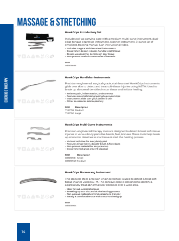 Exercise TherapyMassage & StretchingHawkGrips Introductory SetIncludes roll-up carrying case with a medium multi-curve instrument, dualedge tongue depressor instrument, scanner instrument, 8-ounce jar of emollient, training manual & an instructional video.%u2022 Includes surgical stainless-steel instruments%u2022 Cross-hatch design reduces hand & wrist fatigue%u2022 Breaks up abnormal densities in scar tissue%u2022 Non-porous to eliminate transfer of bacteriaSKU081619899HawkGrips Handlebar InstrumentsPrecision-engineered, surgical-grade, stainless steel HawkGrips instruments glide over skin to detect and treat soft-tissue injuries using IASTM. Used to break up abnormal densities in scar tissue and initiate healing.%u2022 Relieves pain, inflammation, and soreness%u2022 Features cross-hatched gripping to prevent slips%u2022 Instruments slide over your patient%u2019s skin%u2022 Other accessories sold separatelySKU Description7100759 Medium7100760 LargeHawkGrips Multi-Curve InstrumentsPrecision-engineered therapy tools are designed to detect & treat soft-tissue injuries in various body parts like hands, feet, & knees. These tools help break up abnormal densities in scar tissue & start the healing process.%u2022 Various tool sizes for every body part%u2022 Features single-bevel, double-bevel, & flat edges%u2022 Non-porous material for easy cleanup%u2022 Cross-hatched grips prevent slippageSKU Description081619931 Small081619949 MediumHawkGrips Boomerang InstrumentThis stainless steel, precision-engineered tool is used to detect & treat softtissue injuries using IASTM. The concave edge is designed to identify & aggressively treat abnormal scar densities over a wide area.%u2022 Ideal for sub-occipital release%u2022 Breaking up scar tissue aids the healing process%u2022 Non-porous material eliminates bacteria transfer%u2022 Steady & comfortable use with cross-hatched gripSKU08161996414