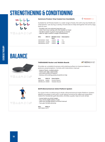Exercise TherapyStrengthening & ConditioningSammons Preston Vinyl-Coated Iron DumbbellsSuitable for all fitness levels in a wide range of sizes, the soft vinyl dumbells are Intended for use during a variety of exercises to help strengthen the arms, legs, back & core.%u2022 Durable cast iron endures long-term use%u2022 Latex-free vinyl coating with size labeled on head%u2022 Handle is easier to grip & more gentle on hands%u2022 Ideal for light-medium weight rehabilitationSKU ENVI # Billable ItemColor Description081030923 11569 A9300 1 lb081030931 10480 A9300 2 lbs081030949 11570 A9300 3 lbsBalanceTHERABAND Rocker and Wobble Boards %u00aeProvides an unstable & sensory-stimulating surface to improve balance, posture, proprioception. Comes with instruction manual.%u2022 Made of black, molded plastic%u2022 Trains core, legs, upper body%u2022 Anti-skid surface on bottom%u2022 Sensory-stimulating pressure points on topSKU ENVI # Description081091115 25083 Rocker Board081084441 25080 Wobble BoardBAPS Biomechanical Ankle Platform SystemFor lower limb conditioning & rehab a Biomechanical Ankle Platform System (BAPS) simulates multi-joint, multi-plane functions for effective treatment. Useful for foot/ankle gait disorders, Achilles, quads, hips & trunk rehab.%u2022 5 pivot balls vary ROM height%u2022 Four 2.5 lb weight plates, 2 rods%u2022 Wall rack storage system & clinical manual%u2022 Two-year limited warrantySKU ENVI #081170869 2417718