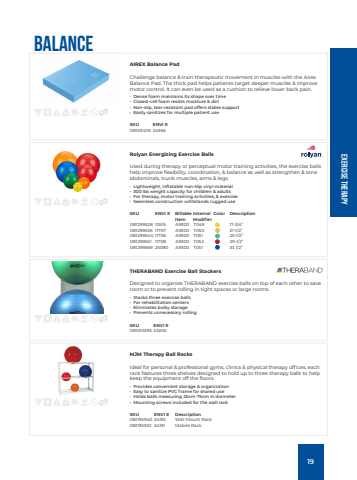 Exercise TherapyBalanceAIREX Balance PadChallenge balance & train therapeutic movement in muscles with the Airex Balance Pad. The thick pad helps patients target deeper muscles & improve motor control. It can even be used as a cushion to relieve lower back pain.%u2022 Dense foam maintains its shape over time%u2022 Closed-cell foam resists moisture & dirt%u2022 Non-slip, tear-resistant pad offers stable support%u2022 Easily sanitizes for multiple patient useSKU ENVI #081034115 24366Rolyan Energizing Exercise BallsUsed during therapy or perceptual motor training activities, the exercise balls help improve flexibility, coordination, & balance as well as strengthen & tone abdominals, trunk muscles, arms & legs.%u2022 Lightweight, inflatable non-slip vinyl material%u2022 300 lbs weight capacity for children & adults%u2022 For therapy, motor training activities, & exercise%u2022 Seamless construction withstands rugged useSKU ENVI # Billable ItemInternal ModifierColor Description081299528 10515 A9300 T049 17-3/4%u201d081299536 11707 A9300 T050 21-1/2%u201d081299544 11706 A9300 T051 25-1/2%u201d081299551 11708 A9300 T052 29-1/2%u201d081299569 25090 A9300 T051 33 1/2%u201dTHERABAND Exercise Ball Stackers %u00aeDesigned to organize THERABAND exercise balls on top of each other to save room or to prevent rolling in tight spaces or large rooms.%u2022 Stacks three exercise balls%u2022 For rehabilitation centers%u2022 Eliminates bulky storage%u2022 Prevents unnecessary rollingSKU ENVI #081510395 23206MJM Therapy Ball RacksIdeal for personal & professional gyms, clinics & physical therapy offices, each rack features three shelves designed to hold up to three therapy balls to help keep the equipment off the floors.%u2022 Provides convenient storage & organization%u2022 Easy to sanitize PVC frame for shared use%u2022 Holds balls measuring 25cm-75cm in diameter%u2022 Mounting screws included for the wall rackSKU ENVI # Description081195940 24192 Wall Mount Rack081195932 24191 Mobile Rack19