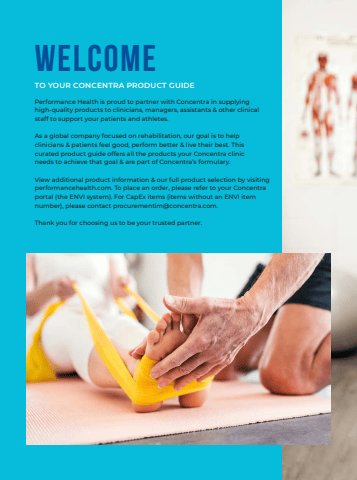 Performance Health is proud to partner with Concentra in supplying high-quality products to clinicians, managers, assistants & other clinical staff to support your patients and athletes.As a global company focused on rehabilitation, our goal is to help clinicians & patients feel good, perform better & live their best. This curated product guide offers all the products your Concentra clinic needs to achieve that goal & are part of Concentra%u2019s formulary.View additional product information & our full product selection by visiting performancehealth.com. To place an order, please refer to your Concentra portal (the ENVI system). For CapEx items (items without an ENVI item number), please contact procurementim@concentra.com.Thank you for choosing us to be your trusted partner.TO YOUR CONCENTRA PRODUCT GUIDEWELCOME