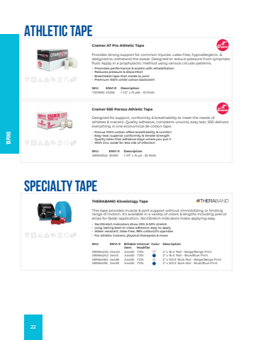 TapingAthletic TapeCramer AT Pro Athletic TapeProvides strong support for common injuries. Latex-free, hypoallergenic, & designed to withstand the sweat. Designed to reduce pressure from lymphatic fluid. Apply in a prophylactic method using various circular patterns.%u2022 Promotes performance & assists with rehabilitation%u2022 Reduces pressure & discomfort%u2022 Breathable tape that molds to joint%u2022 Premium 100% white cotton backclothSKU ENVI # Description7201690 24255 1-1/2%u201d x 15 yds - 32 RollsCramer 950 Porous Athletic TapeDesigned for support, conformity & breathability to meet the needs of athletes & trainers. Quality adhesive, consistent unwind, easy tear, 950 delivers everything in one economical all-cotton tape.%u2022 Porous 100% cotton offers breathability & comfort%u2022 Easy-tear; superior conformity & tensile strength%u2022 Quality latex-free adhesive stays where you put it%u2022 With zinc oxide for less risk of infectionSKU ENVI # Description081613942 25059 1-1/2%u201d x 15 yd - 32 RollsSpecialty TapeTHERABAND Kinesiology Tape %u00aeThis tape provides muscle & joint support without immobilizing or limiting range of motion. It%u2019s available in a variety of colors & lengths including precut strips for faster application. XactStretch Indicators make applying easy.%u2022 XactStretch Indicators show 25% & 50% stretch%u2022 Long lasting best-in-class adhesive, easy to apply%u2022 Water resistant, latex-free, 98% cotton/2% spandex%u2022 For athletic trainers, physical therapists & moreSKU ENVI # Billable ItemInternal ModifierColor Description081664234 24440 A4450 T215 2%u201d x 16.4%u2019 Roll - Beige/Beige Print081664242 24441 A4450 T215 2%u201d x 16.4%u2019 Roll - Blue/Blue Print081664184 24438 A4450 T215 2%u201d x 103.3%u2019 Bulk Roll - Beige/Beige Print081664192 24439 A4450 T215 2%u201d x 103.3%u2019 Bulk Roll - Blue/Blue Print22