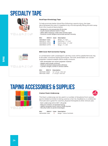 TapingSpecialty TapeRockTape Kinesiology TapeTo help promote better blood flow following a sports injury, the tape decompresses the area it is applied to by microscopically lifting the skin away from the muscle & fascia below.%u2022 Designed to microscopically lift the skin%u2022 Acrylic-based adhesive lasts 2-7 days%u2022 Offers 180% elasticity unlike other kinesio tapes%u2022 Prevents muscle fatigue & promotes quicker recoverySKU ENVI # Color Description081678630 23316 Beige - 2%u201d x 16.4%u2019081678713 23317 Navy Blue - 2%u201d x 16.4%u2019081678895 23792 Electric Blue - 2%u201d x 105%u2019081678929 23770 Beige - 2%u201d x 105%u2019BSN Cover Roll Corrective TapingIn combination with Leukotape P, use this cover roll for patella-femoral, hip, & shoulder corrective taping techniques. The soft, stretchable non-woven polyester material adapts well to body contours.%u2022 Soft, stretchable non-woven polyester material%u2022 Adapts well to body contours%u2022 Moisture resistant polyacrylate adhesive%u2022 4 yards in length, comes in various widthsSKU ENVI # Description081171230 10500 1.5%u201d x 10 yd - One roll081171255 10501 2%u201d x 10 yd - One rollTaping Accessories & SuppliesCramer Foam UnderwrapThis foam underwrap can be used in a number of situations from various sports related activities to being used as a hair tie, headband, or wristbands. The bulk size is great for coaches, physical therapists & other clinical uses.%u2022 Each underwrap roll is 2-3/4%u201d x 30 yards%u2022 Reduces irritation of repeated taping%u2022 Lightly compress minor wrist or ankle injuries%u2022 Securely holds ice packs & bandagesSKU ENVI # Color Description081242999 12261 Beige - Case of 48 Rolls24
