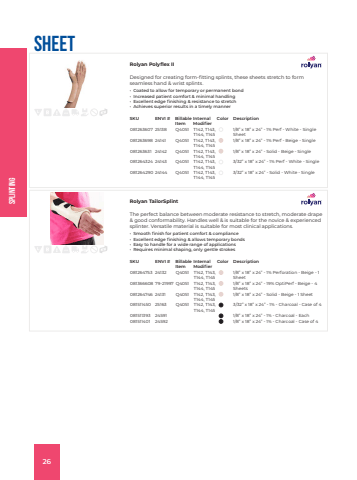 SplintingSheetRolyan Polyflex IIDesigned for creating form-fitting splints, these sheets stretch to form seamless hand & wrist splints.%u2022 Coated to allow for temporary or permanent bond%u2022 Increased patient comfort & minimal handling%u2022 Excellent edge finishing & resistance to stretch%u2022 Achieves superior results in a timely mannerSKU ENVI # Billable ItemInternal ModifierColor Description081263607 25138 Q4051 T142, T143, T144, T1451/8%u201d x 18%u201d x 24%u201d - 1% Perf - White - Single Sheet081263698 24141 Q4051 T142, T143, T144, T1451/8%u201d x 18%u201d x 24%u201d - 1% Perf - Beige - Single081263631 24142 Q4051 T142, T143, T144, T1451/8%u201d x 18%u201d x 24%u201d - Solid - Beige - Single081264324 24143 Q4051 T142, T143, T144, T1453/32%u201d x 18%u201d x 24%u201d - 1% Perf - White - Single081264290 24144 Q4051 T142, T143, T144, T1453/32%u201d x 18%u201d x 24%u201d - Solid - White - SingleRolyan TailorSplintThe perfect balance between moderate resistance to stretch, moderate drape & good conformability. Handles well & is suitable for the novice & experienced splinter. Versatile material is suitable for most clinical applications.%u2022 Smooth finish for patient comfort & compliance%u2022 Excellent edge finishing & allows temporary bonds%u2022 Easy to handle for a wide range of applications%u2022 Requires minimal shaping, only gentle strokesSKU ENVI # Billable ItemInternal ModifierColor Description081264753 24132 Q4051 T142, T143, T144, T1451/8%u201d x 18%u201d x 24%u201d - 1% Perforation - Beige - 1 Sheet081366608 79-21997 Q4051 T142, T143, T144, T1451/8%u201d x 18%u201d x 24%u201d - 19% OptiPerf - Beige - 4 Sheets081264746 24131 Q4051 T142, T143, T144, T1451/8%u201d x 18%u201d x 24%u201d - Solid - Beige - 1 Sheet081511450 25163 Q4051 T142, T143, T144, T1453/32%u201d x 18%u201d x 24%u201d - 1% - Charcoal - Case of 4081511393 24591 1/8%u201d x 18%u201d x 24%u201d - 1% - Charcoal - Each081511401 24592 1/8%u201d x 18%u201d x 24%u201d - 1% - Charcoal - Case of 426