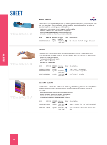 SplintingSheetRolyan EzeformDesigned to act like an extra pair of hands during fabrication of the splint, the low temperature thermoplastic is intended for spasticity splints, functional position splints & resting pan mitt splints.%u2022 Maximum resistance to stretch & good conformability%u2022 Ideal for patients who are unable to cooperate%u2022 Slightly tacky when heated to maintain position%u2022 Uncoated surface to allow for permanent bondsSKU ENVI # Billable ItemInternal ModifierColor Description081539550 22645 Q4051 T142, T143, T144, T1451/8 x 18 x 24 - 1% Perf - Single - CharcoalOrficastUsed for quick immobilization of the fingers & thumb in cases of trauma, Orficast can be molded directly on the patient without the risk of skin burns.%u2022 Easily cut to desired length%u2022 Features knitted hybrid fabric%u2022 Does not burn the skin%u2022 Suitable for fragile skinSKU ENVI # Billable ItemInternal ModifierColor Description081616002 22644 Q4051 1.18%u201d X 9.8 FT - Single Roll081616028 25050 Q4051 T142, T143, T144, T1452.36 %u201c X 9.8 FT - Single Roll081677863 25129 Q4051 T142, T143, T144, T1452.36%u201d X 9.8 FT - 6 RollsColors NS by OrfitMolded for 4-6 minutes with 100% memory after being heated in water, these metallic thermoplastic sheets can be molded into stabilization braces & orthoses.%u2022 Features non-stick coating that prevents clinging%u2022 Variety of colors promotes patient compliance%u2022 Minimum to moderate stretch resistance%u2022 Finished with smooth edges & glossy surfaceSKU ENVI # Billable ItemInternal ModifierColor Description081437987 23539 Q4051 T142, T143, T144, T145Black - Single - 1/12%u201d x 18%u201d x 24%u201d MicroPerf081152222 23538 Q4051 T142, T143, T144, T1451/12%u201d X 18%u201d X 24%u201d- Micro Perf - Silver - Single28