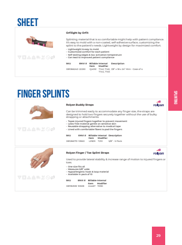 SplintingSheetOrfilight by OrfitSplinting material that is so comfortable might help with patient compliance. It%u2019s easy to mold with a non-coated, self-adhesive surface, customizing the splint to the patient%u2019s needs. Lightweight by design for maximized comfort.%u2022 Lightweight & easy to mold%u2022 Customized comfort for each patient%u2022 Self-sealing edges & low activation temperature%u2022 Can lead to improved patient complianceSKU ENVI # Billable ItemInternal ModifierDescription081066240 22253 Q4051 T142, T143, T144, T1451/8%u201d x 18 x 24%u201d Mini - Case of 4Finger SplintsRolyan Buddy StrapsCan be trimmed easily to accommodate any finger size, the straps are designed to hold two fingers securely together without the use of bulky strapping or attachments.%u2022 Tapes injured fingers together to prevent movement%u2022 Latex-free material gentle on sensitive skin%u2022 Reusable strapping alternative to medical tape%u2022 Lined with comfortable fibers to pad the fingersSKU ENVI # Billable ItemInternal ModifierDescription081266170 10550 L3929 T213 5/8%u201d - 5 PackRolyan Finger / Toe Splint StrapsUsed to provide lateral stability & increase range of motion to injured fingers or toes.%u2022 One size fits all%u2022 Measures 5/8%u201d wide%u2022 Hypoallergenic hook & loop material%u2022 Available in pack of 10SKU ENVI # Billable ItemInternal Modifier081182518 10508 A4467 T09029