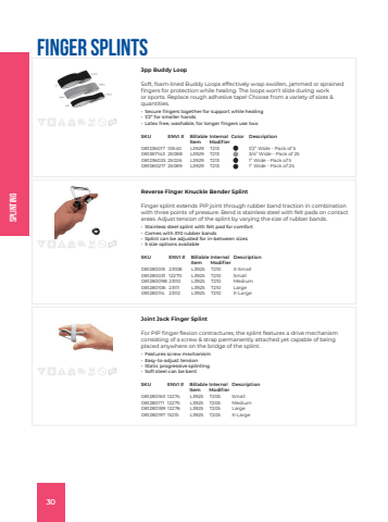 SplintingFinger Splints3pp Buddy LoopSoft, foam-lined Buddy Loops effectively wrap swollen, jammed or sprained fingers for protection while healing. The loops won%u2019t slide during work or sports. Replace rough adhesive tape! Choose from a variety of sizes & quantities.%u2022 Secure fingers together for support while healing%u2022 1/2%u201d for smaller hands%u2022 Latex free, washable, for longer fingers use twoSKU ENVI # Billable ItemInternal ModifierColor Description081236017 10540 L3929 T213 1/2%u201d Wide - Pack of 5081367143 25088 L3929 T213 3/4%u201d Wide - Pack of 25081236025 25026 L3929 T213 1%u201d Wide - Pack of 5081080217 25089 L3929 T213 1%u201d Wide - Pack of 25Reverse Finger Knuckle Bender SplintFinger splint extends PIP joint through rubber band traction in combination with three points of pressure. Bend is stainless steel with felt pads on contact areas. Adjust tension of the splint by varying the size of rubber bands.%u2022 Stainless steel splint with felt pad for comfort%u2022 Comes with #10 rubber bands%u2022 Splint can be adjusted for in-between sizes%u2022 5 size options availableSKU ENVI # Billable ItemInternal ModifierDescription081280015 23108 L3925 T210 X-Small081280031 12270 L3925 T210 Small081280098 23110 L3925 T210 Medium081280106 23111 L3925 T210 Large081280114 23112 L3925 T210 X-LargeJoint Jack Finger SplintFor PIP finger flexion contractures, the splint features a drive mechanism consisting of a screw & strap permanently attached yet capable of being placed anywhere on the bridge of the splint.%u2022 Features screw mechanism%u2022 Easy-to-adjust tension%u2022 Static progressive splinting%u2022 Soft steel can be bentSKU ENVI # Billable ItemInternal ModifierDescription081280163 12274 L3925 T205 Small081280171 12275 L3925 T205 Medium081280189 12276 L3925 T205 Large081280197 15215 L3925 T205 X-Large30