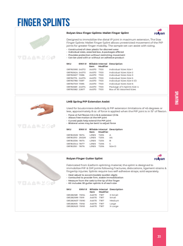 SplintingFinger SplintsRolyan Stax Finger Splints: Mallet Finger SplintDesigned to immobilize the distal IP joint in maximum extension, The Stax Finger Splints: Mallet Finger Splint allows unrestricted movement of the PIP joints for greater finger mobility. The sample set can assist with sizing.%u2022 Constructed of clear plastic for discreet wear%u2022 Individual sizes, assorted box, & packages offered%u2022 Provides protection without restricting movement%u2022 Can be used with or without an adhesive productSKU ENVI # Billable ItemInternal ModifierDescription081192590 24072 A4570 T103 Individual Sizes Size 1081192624 24073 A4570 T103 Individual Sizes Size 2081192657 11596 A4570 T103 Individual Sizes Size 3081192715 24075 A4570 T103 Individual Sizes Size 5081192780 11597 A4570 T103 Individual Sizes Size 5 1/2081192749 11595 A4570 T103 Individual Sizes Size 6081192681 24074 A4570 T103 Package of 5 Splints Size 4081192582 22617 A4570 T103 Box of 30 Assorted SizesLMB Spring PIP Extension AssistUsed for boutonniere deformity & PIP extension limitations of 45 degrees or less, approximately 8 oz. of force is applied when the PIP joint is in 15%u00b0 of flexion.%u2022 Force at full flexion 3.5-4 lb & extension 1/2 lb%u2022 Allows free motion at the MP joint%u2022 Curved pads help extend the PIP joint%u2022 Bilateral wires may be bent to adjust forceSKU ENVI # Billable ItemInternal ModifierDescription081182328 11674 L3925 T205 A081182310 25028 L3925 T205 AA081182336 11675 L3925 T205 B081182344 11677 L3925 T206 C081182351 11676 L3925 T206 Size DRolyan Finger Gutter SplintFabricated from Ezeform splinting material, the splint is designed to immobilize PIP & DIP joints following fractures, dislocations, ligament strains & fingertip injuries. Splints require two self-adhesive straps, sold separately.%u2022 Heat adjust to accommodate swollen digits%u2022 Contoured to provide firm, stable immobilization%u2022 Measure from the web to the tip of the finger%u2022 Kit includes 30 gutter splints: 6 of each sizeSKU ENVI # Billable ItemInternal ModifierDescription081282581 11594 A4570 T187 X-Small081282599 11591 A4570 T187 Small081282607 11590 A4570 T187 Medium081282615 11592 A4570 T187 Large081282623 11593 A4570 T187 X-Large31