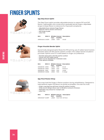 SplintingFinger Splints3pp Step Down SplintThe Step Down splint provides adjustable tension to restore PIP and DIP flexion. Lightweight wire construction gradually bends fingers. Adjustable straps increase flexion to tolerance for improved compliance.%u2022 Adjustable force restores finger flexion%u2022 Reduces mild-to-severe contracture%u2022 Soft straps & pads%u2022 Latex freeSKU ENVI # Billable ItemInternal ModifierDescription081504240 24029 L3925 T209 SmallFinger Knuckle Bender SplintDynamically designed splint flexes the PIP joint by use of rubber band traction. Stainless steel with felt pad for patient comfort. #10 rubber bands included in purchase. Splints come in 5%u00a0sizes based on finger circumference.%u2022 Stainless steel splint with felt pad for comfort%u2022 Comes with #10 rubber bands%u2022 Splint can be adjusted for in-between sizes%u2022 5 size options availableSKU ENVI # Billable ItemInternal ModifierDescription081280130 23159 L3925 T210 Small081280148 23160 L3925 T210 Medium081280155 23161 L3925 T210 Large081280023 24066 L3925 T210 X-Large3pp Final Flexion WrapThis wrap hold the finger in flexion position during rehabilitation. Designed to help patients regain full flexion as quickly as possible. One size fits most.%u2022 Finger wrap features soft foam lining for patient comfort%u2022 Wrap around design allows user to decide on amount of tension%u2022 Washable wrap allows for multiple uses%u2022 Latex freeSKU ENVI # Billable ItemInternal ModifierDescription081549427 24087 L3929 T212-T213 25 Pack34
