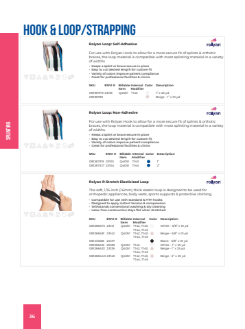 SplintingHook & Loop/StrappingRolyan Loop: Self-AdhesiveFor use with Rolyan Hook to allow for a more secure fit of splints & orthotic braces, the loop material is compatible with most splinting material in a variety of widths.%u2022 Keeps a splint or brace secure in place%u2022 Easy to cut desired length for custom fit%u2022 Variety of colors improve patient compliance%u2022 Great for professional facilities & clinicsSKU ENVI # Billable ItemInternal ModifierColor Description081181973 23135 Q4051 T143 1%u201d x 25 yd081181981 Beige - 1%u201d x 10 ydRolyan Loop: Non-AdhesiveFor use with Rolyan Hook to allow for a more secure fit of splints & orthotic braces, the loop material is compatible with most splinting material in a variety of widths.%u2022 Keeps a splint or brace secure in place%u2022 Easy to cut desired length for custom fit%u2022 Variety of colors improve patient compliance%u2022 Great for professional facilities & clinicsSKU ENVI # Billable ItemInternal ModifierColor Description081267319 23103 Q4051 T143 1%u201d081267327 23104 Q4051 T144 2%u201dRolyan R-Stretch Elasticized LoopThe soft, 1/16 inch (1.6mm) thick elastic loop is designed to be used for orthopedic appliances, body vests, sports supports & protective clothing.%u2022 Compatible for use with standard & HTH hooks%u2022 Designed to apply instant tension & compression%u2022 Withstands conventional washing & dry cleaning%u2022 Latex-free construction stays flat when stretchedSKU ENVI # Billable ItemInternal ModifierColor Description081268473 23141 Q4051 T142, T143, T144, T145White - 5/8%u201d x 10 yd081268481 23142 Q4051 T142, T143, T144, T145Beige - 5/8%u201d x 10 yd081412568 24137 Black - 5/8%u201d x 10 yd081268416 25128 Q4051 T143 White - 1%u201d x 25 yd081268432 23139 Q4051 T142, T143, T144, T145Beige - 1%u201d x 25 yd081268440 23140 Q4051 T142, T143, T144, T145Beige - 2%u201d x 25 yd36