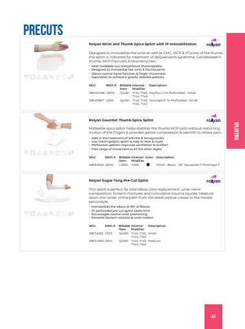 SplintingPrecutsRolyan Wrist and Thumb Spica Splint with IP ImmobilizationDesigned to immobilize the wrist as well as CMC, MCP & IP joints of the thumb, the splint is indicated for treatment of deQuervain%u2019s syndrome, Gamekeeper%u2019s thumb, MCP fractures & reconstruction.%u2022 Heat moldable low-temperature thermoplastic%u2022 Designed to immobilize the wrist & thumb joints%u2022 Allows normal hand function & finger movement%u2022 Supination to achieve a gravity-assisted positionSKU ENVI # Billable ItemInternal ModifierDescription081047356 23100 Q4051 T142, T143, T144, T145Polyflex II 2% Perforated - Small081431857 23101 Q4051 T142, T143, T144, T145TailorSplint 1% Perforated - SmallRolyan Gauntlet Thumb Spica SplintMalleable spica splint helps stabilize the thumb MCP joint without restricting motion of the fingers & provides gentle compression & warmth to relieve pain.%u2022 Aids in the treatment of arthritis & tenosynovitis%u2022 Low thermoplastic splint is easy to heat & mold%u2022 Perforation pattern improves ventilation & comfort%u2022 Free range of movement to all the other digitsSKU ENVI # Billable ItemInternal ModifierColor Description081153022 23102 L3925 T206 Small - Black - 1/6%u201d Aquaplast-T ProDrape-TRolyan Sugar Tong Pre-Cut SplintThis splint is perfect for total elbow joint replacement, ulnar nerve transposition, forearm fractures and cumulative trauma injuries. Measure down the center of the palm from the distal palmar crease to the medial epicondyle.%u2022 Immobilizes the elbow at 90%u00b0 of flexion%u2022 1% perforated pre-cut splint saves time%u2022 Encourages neutral wrist positioning%u2022 Prevents forearm rotation & wrist motionSKU ENVI # Billable ItemInternal ModifierDescription081114552 23113 Q4051 T142, T143, T144, T145Small081114560 23114 Q4051 T142, T143, T144, T145Medium41