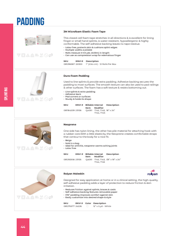 SplintingPadding3M Microfoam Elastic Foam TapeThis closed-cell foam tape stretches in all directions & is excellent for lining finger or small hand splints, is water-resistant, hypoallergenic & highly conformable. The self-adhesive backing leaves no tape residue.%u2022 Latex-free, protects skin & cushions splint edges%u2022 Multiple widths available%u2022 Rolls measure 5-1/2 yds. (5.03m) in length%u2022 Can use as compression wrap for edematous fingerSKU ENVI # Description081296367 22000 1%u201d (2.54 cm) - 12 Rolls Per BoxDura-Foam PaddingUsed to line splints & provide extra padding. Adhesive backing secures the padding to most surfaces. The smooth texture can also be used to pad railings & other surfaces. The foam has a soft texture & resists bottoming out.%u2022 Line splints & extra padding%u2022 Adhesive back%u2022 Pad corners or surfaces%u2022 Sturdy & holds its shapeSKU ENVI # Billable ItemInternal ModifierDescription081184209 23106 Q4051 T142, T143, T144, T14518%u201d x 24%u201dNeopreneOne side has nylon lining, the other has pile material for attaching hook with a rubber core.With a little elasticity, the Neoprene creates comfortable straps that contour to the body for a nice fit.%u2022 Beige%u2022 Sold in a bag%u2022 Ideal for arthritis, neoprene warms aching joints%u2022 Latex freeSKU ENVI # Billable ItemInternal ModifierDescription081292556 23105 Q4051 T142, T143, T144, T1451/8%u201d x 18%u201d x 24%u201dRolyan MoleskinDesigned for easy application at home or in a clinical setting, the high-quality, self-adhesive padding adds a layer of protection to reduce friction & skin irritation.%u2022 Reduces friction against splints, braces & casts%u2022 Self-adhesive backing features removable paper%u2022 1/16%u201d padding improves comfort against skin%u2022 Easily customize into desired shape & styleSKU ENVI # Color Description081275577 24226 12%u201d x 5 yd - White44