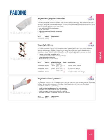 SplintingPaddingRolyan Cotton/Polyester StockinetteThis stockinette is designed for use under casts or splints. The material is soft & smooth and has moderate stretch for conformability without construction. The stockinette is guaranteed seamless.%u2022 Non-sterile with blended weave%u2022 25 yd. long rolls%u2022 Useful for various medical situations%u2022 Latex freeSKU ENVI # Description081286186 23600 2%u201dRolyan Splint LinersDurable two-ply cotton stockinette liners are extra-thick & soft with finished seams & overcast edges. Protects the skin from friction and helps to wick moisture away & let the skin breathe while wearing a splint, brace, or cast.%u2022 Comes in one size, package of 10%u2022 Liners are reusable and machine washable%u2022 Helps wick way moisture%u2022 Protects the skin from frictionSKU ENVI # Billable ItemInternal ModifierColor Description081186980 16046 Q4051 T142, T143, T144, T145Thumb Spica - Beige081186998 13745 Q4051 T142, T143, T144, T145Wrist/Hand - Beige081187004 16047 Wrist/Hand/Thumb - BeigeRolyan Stockinette Splint LinerTo provide comfort to injuries while healing, the soft thumb spica liner provides a layer of comfort between the skin & splints to prevent uncomfortable irritation, friction, & pinching.%u2022 Easily can be hand washed for multiple uses%u2022 Ideal for use underneath thumb spica splints%u2022 Made of single-ply polyester/cotton material%u2022 Includes flat seam to provide maximum comfortSKU ENVI # Description081050921 13154 Medium45