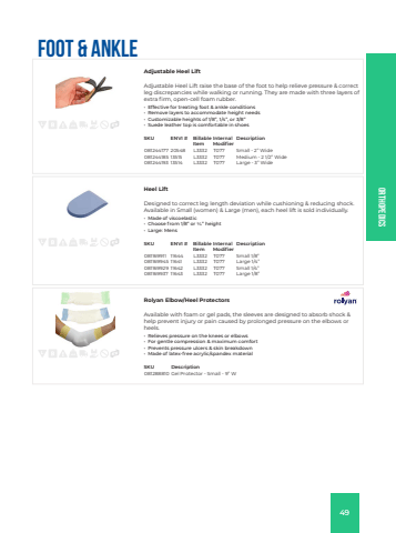 OrthopedicsFoot & AnkleAdjustable Heel LiftAdjustable Heel Lift raise the base of the foot to help relieve pressure & correct leg discrepancies while walking or running. They are made with three layers of extra firm, open-cell foam rubber.%u2022 Effective for treating foot & ankle conditions%u2022 Remove layers to accommodate height needs%u2022 Customizable heights of 1/8%u201d, 1/4%u201d, or 3/8%u201d%u2022 Suede leather top is comfortable in shoesSKU ENVI # Billable ItemInternal ModifierDescription081244177 20548 L3332 T077 Small - 2%u201d Wide081244185 13515 L3332 T077 Medium - 2 1/2%u201d Wide081244193 13514 L3332 T077 Large - 3%u201d WideHeel LiftDesigned to correct leg length deviation while cushioning & reducing shock. Available in Small (women) & Large (men), each heel lift is sold individually.%u2022 Made of viscoelastic%u2022 Choose from 1/8%u201d or %u00bc%u201d height%u2022 Large: MensSKU ENVI # Billable ItemInternal ModifierDescription081169911 11644 L3332 T077 Small 1/8%u201d081169945 11641 L3332 T077 Large 1/4%u201d081169929 11642 L3332 T077 Small 1/4%u201d081169937 11643 L3332 T077 Large 1/8%u201dRolyan Elbow/Heel ProtectorsAvailable with foam or gel pads, the sleeves are designed to absorb shock & help prevent injury or pain caused by prolonged pressure on the elbows or heels.%u2022 Relieves pressure on the knees or elbows%u2022 For gentle compression & maximum comfort%u2022 Prevents pressure ulcers & skin breakdown%u2022 Made of latex-free acrylic/spandex materialSKU Description081288810 Gel Protector - Small - 9%u201d W49