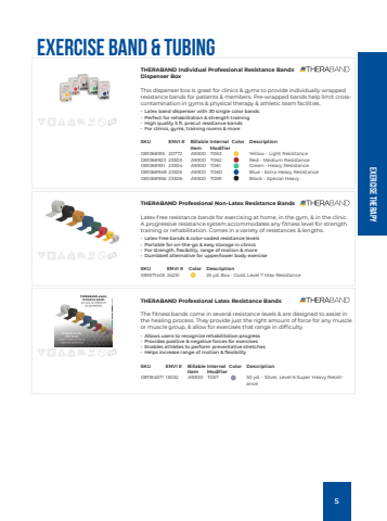 Exercise TherapyExercise Band & TubingTHERABAND Individual Professional Resistance Bands Dispenser Box%u00aeThis dispenser box is great for clinics & gyms to provide individually wrapped resistance bands for patients & members. Pre-wrapped bands help limit crosscontamination in gyms & physical therapy & athletic team facilities.%u2022 Latex band dispenser with 30 single color bands%u2022 Perfect for rehabilitation & strength training%u2022 High quality 5 ft. precut resistance bands%u2022 For clinics, gyms, training rooms & moreSKU ENVI # Billable ItemInternal ModifierColor Description081068915 20772 A9300 T063 Yellow - Light Resistance081068923 23303 A9300 T062 Red - Medium Resistance081068931 23304 A9300 T061 Green - Heavy Resistance081068949 23305 A9300 T060 Blue - Extra Heavy Resistance081068956 23306 A9300 T059 Black - Special HeavyTHERABAND Professional Non-Latex Resistance Bands %u00aeLatex-free resistance bands for exercising at home, in the gym, & in the clinic. A progressive resistance system accommodates any fitness level for strength training or rehabilitation. Comes in a variety of resistances & lengths.%u2022 Latex-free bands & color-coded resistance levels%u2022 Portable for on-the-go & easy storage in clinics%u2022 For strength, flexibility, range of motion & more%u2022 Dumbbell alternative for upper/lower body exerciseSKU ENVI # Color Description081671403 24251 25 yd. Box - Gold, Level 7 Max ResistanceTHERABAND Professional Latex Resistance Bands %u00aeThe fitness bands come in several resistance levels & are designed to assist in the healing process. They provide just the right amount of force for any muscle or muscle group, & allow for exercises that range in difficulty.%u2022 Allows users to recognize rehabilitation progress%u2022 Provides positive & negative forces for exercises%u2022 Enables athletes to perform preventative stretches%u2022 Helps increase range of motion & flexibilitySKU ENVI # Billable ItemInternal ModifierColor Description081184571 13032 A9300 T057 50 yd. - Silver, Level 6 Super Heavy Resistance5