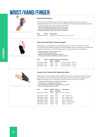 OrthopedicsWrist/Hand/FingerBauerfeind RhizoLocFeaturing a VELCRO%u00ae thumb tab for optional adjustment, the orthosis provides stabilization of the thumb saddle & first metacarpophalangeal joints.%u2022 Limitable release of motion at base of the thumb%u2022 Features individually shapable aluminum strap%u2022 Hook & loop fastenings ensure ease of handling%u2022 Breathable design with air pores for circulationSKU ENVI # Description081332816 24079 Left, Size 1 - Wrist Circum. 4-3/4%u201d - 6-1/4%u201dRCAI Universal Wrist & Thumb SupportStabilize your thumb/wrist by limiting extreme motion of the joints in the thumb/wrist. Bendable metal stay limits radial & palmar abduction. Breathable airprene maintains comfort for long-term use to aid various conditions.%u00a0%u2022 Supports joints in the thumb & wrist%u2022 Universal for left & right hand%u2022 Made of breathable airprene for comfort%u2022 Configuration options & different sizes availableSKU ENVI # Billable ItemInternal ModifierDescription081432178 11768 L3923 T155 Thumb Support - Small081432186 11767 L3923 T155 Thumb Support - Medium081432194 11766 L3923 T155 Thumb Support - LargeComfort Cool Thumb CMC Abduction SplintFeaturing a thumb strap to help stabilize the first metacarpal & open thumb web space, microwave the thumb strap to soften the thermoplastic insert before molding it to fit precisely along the thenar eminence crease.%u2022 Improves hand function & supports CMC joint%u2022 Includes firm, moldable thumb insert%u2022 For contractures, arthritis & median nerve injuries%u2022 Does not impede finger functionSKU ENVI # Billable ItemInternal ModifierDescription081156470 23309 L3807 T154, T175, T203Left - Large081701788 24049 L3807 T154 Left - Small Plus081701804 24051 L3807 T154 Left - Medium Plus081701820 24053 L3807 T154 Left - Large Plus081701796 24050 L3807 T154 Right - Small Plus081701812 24052 L3807 T154 Right - Medium Plus081701838 24054 L3807 T154 Right - Large Plus56