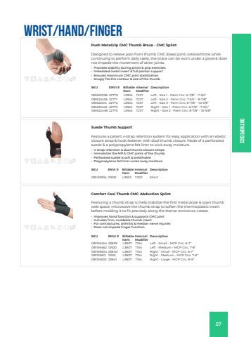 OrthopedicsWrist/Hand/FingerPush MetaGrip CMC Thumb Brace - CMC SplintDesigned to relieve pain from thumb CMC (basal joint) osteoarthritis while continuing to perform daily tasks, the brace can be worn under a glove & does not impede the movement of other joints.%u2022 Provides stability during pinch & grip exercises%u2022 Imbedded metal insert & full palmar support%u2022 Ensures maximum CMC joint stabilization%u2022 Snugly fits the contour & size of the thumbSKU ENVI # Billable ItemInternal ModifierDescription081622398 22770 L3924 T237 Left - Size 1 - Palm Circ. 6-7/8%u201d - 7-3/4%u201d081622406 22771 L3924 T237 Left - Size 2 - Palm Circ. 7-3/4%u201d - 8-7/8%u201d081622414 22772 L3924 T237 Left - Size 3 - Palm Circ. 8-7/8%u201d - 10-5/8%u201d081622422 22773 L3924 T237 Right - Size 1 - Palm Circ. 6-7/8%u201d - 7-3/4%u201d081622448 22775 L3924 T237 Right - Size 3 - Palm Circ. 8-7/8%u201d - 10-5/8%u201dSuede Thumb SupportFeatures a patent v-strap retention system for easy application with an elastic closure strap &%u00a0hook fastener with dual thumb closure. Made of a perforated suede & a polypropylene felt liner to wick away moisture.%u00a0%u2022 V-strap retention & dual thumb closure straps%u2022 Immobilize the MP &%u00a0CMC joints of the thumb%u00a0%u2022 Perforated suede is soft & breathable%u2022 Polypropylene felt liner wicks away moistureSKU ENVI # Billable ItemInternal ModifierDescription081419324 21602 L3923 T202 ShortComfort Cool Thumb CMC Abduction SplintFeaturing a thumb strap to help stabilize the first metacarpal & open thumb web space, microwave the thumb strap to soften the thermoplastic insert before molding it to fit precisely along the thenar eminence crease.%u2022 Improves hand function & supports CMC joint%u2022 Includes firm, moldable thumb insert%u2022 For contractures, arthritis & median nerve injuries%u2022 Does not impede finger functionSKU ENVI # Billable ItemInternal ModifierDescription081156454 23839 L3807 T154 Left - Small - MCP Circ. 6-7%u201d081156462 13920 L3807 T154 Left - Medium - MCP Circ. 7-8%u201d081156504 23840 L3807 T154 Right - Small - MCP Circ. 6-7%u201d081156512 13921 L3807 T154 Right - Medium - MCP Circ. 7-8%u201d081156520 23841 L3807 T154 Right - Large - MCP Circ. 8-9%u201d57