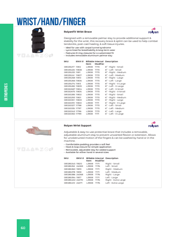 OrthopedicsWrist/Hand/FingerRolyanFit Wrist BraceDesigned with a removable palmar stay to provide additional support & stability for the wrist, this recovery brace & splint can be used to help combat tendonitis, post-cast healing, & soft tissue injuries.%u2022 Ideal for use with carpal tunnel syndrome%u2022 Lycra-lined for breathability & long-term wear%u2022 Features D-ring closures for a customized fit%u2022 Includes removable aluminum palmar staySKU ENVI # Billable ItemInternal ModifierDescription081235217 11812 L3908 T173 8%u201d - Right - Small081235225 11808 L3908 T173 8%u201d - Left - Small081235233 11811 L3908 T173 8%u201d - Right - Medium081235241 11807 L3908 T173 8%u201d - Left - Medium081235258 11810 L3908 T173 8%u201d - Right - Large081235266 11806 L3908 T173 8%u201d - Left - Large081235274 11813 L3908 T173 8%u201d - Right - X-Large081235282 11809 L3908 T173 8%u201d - Left - X-Large081252667 11804 L3908 T173 6%u201d - Left - X-Small081252675 11805 L3908 T173 6%u201d - Right - X-Small081253285 11802 L3908 T173 6%u201d - Right - Small081253293 11801 L3908 T173 6%u201d - Right - Medium081253301 11800 L3908 T173 6%u201d - Right - Large081253319 11803 L3908 T171 6%u201d - Right - X-Large081253327 11798 L3908 T173 6%u201d - Left - Small081253335 11797 L3908 T173 6%u201d - Left - Medium081253343 11796 L3908 T173 6%u201d - Left - Large081253350 11799 L3908 T171 6%u201d - Left - X-LargeRolyan Wrist SupportAdjustable & easy-to-use protective brace that includes a removable, adjustable aluminum stay to prevent unwanted flexion or extension. Allows for unobstructed motion of the fingers & can be washed by hand or in the machine.%u2022 Comfortable padding provides a soft feel%u2022 Hook & loop closure for simple application%u2022 Removable, adjustable stay for added support%u2022 Available for either hand in several sizesSKU ENVI # Billable ItemInternal ModifierDescription081285345 11820 L3908 T171 Right - Small081285352 24069 L3908 T176 Left - Small081285360 11819 L3908 T171 Right - Medium081285378 11818 L3908 T171 Left - Medium081285386 24068 L3908 T176 Right - Large081285394 11817 L3908 T171 Left - Large081285402 24070 L3908 T176 Right - Extra Large081285410 24071 L3908 T176 Left - Extra Large60
